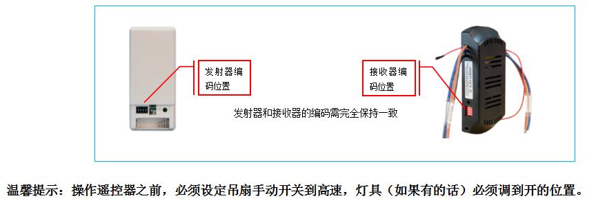 ◆16组编码:本产品发射和接收器上分别装有4位拨码开关, 可设置16组不同编码,只有当发射器和接收器编码一致时,遥控器才能控制吊扇。客户可自由选择一只遥控器控制多台吊扇的开关,也可设置不同编码,满足同一空间多台吊扇分别独立工作。