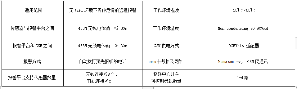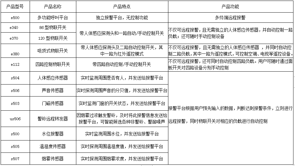 野外安防报警系统由多功能报警平台、GSM智能报警器和多个传感器组成,其中报警平台有二种,一是独立的报警平台,仅限将报警信息发送到多个智能终端;二是将报警平台集成在物联开关中,因此物联开关既是报警平台,也是控制开关,在远程报警的同时,还可自动开启摄像头、警铃、自动门、水阀机械手等,对各种设备进行自动控制,部分物联开关还具有人体感应和手动控控制功能。具体型号如下: