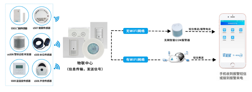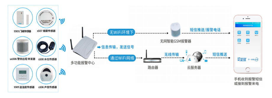 本系统包含多个传感器、远程报警平台、GSM智能报警器及用户手机终端四个部分(GSM模式选配p502)。相对传统的报警系统,其优势如下: